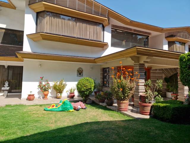 Amplia estancia comedor con vista al patio, amplia sala con cantina y chimenea y vista al jardín, amplia cocina equipada con alacena, medio baño para visitas, estudio con medio baño. Patio trasero con área de asador con fuente, 2 cuartos de servicio con baño completo cada uno, área de lavado con conexión para lavadora y desagüe, jardín al frente, lugar para 4 a 5 autos, cuarto para vigilante o conserje con baño, bodega y cuarto de juegos o recepción.